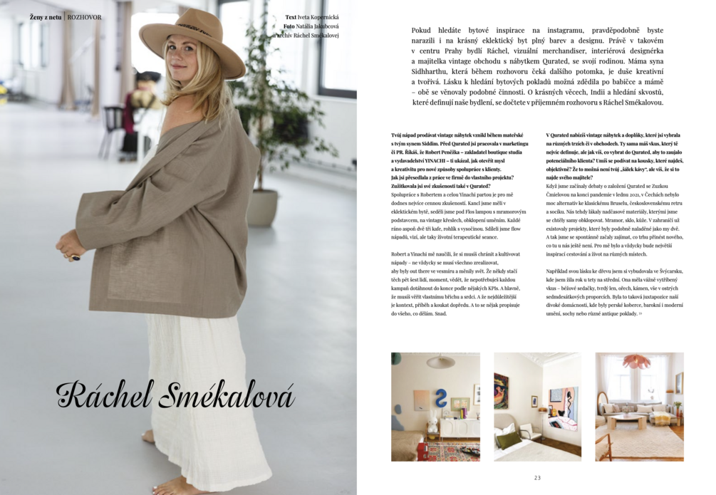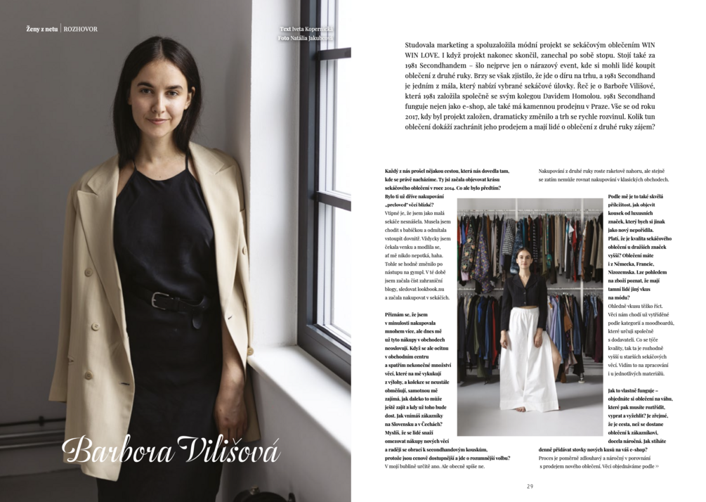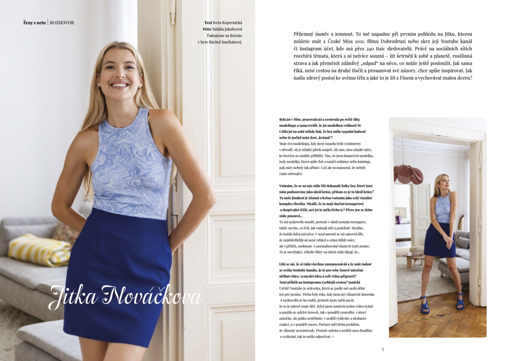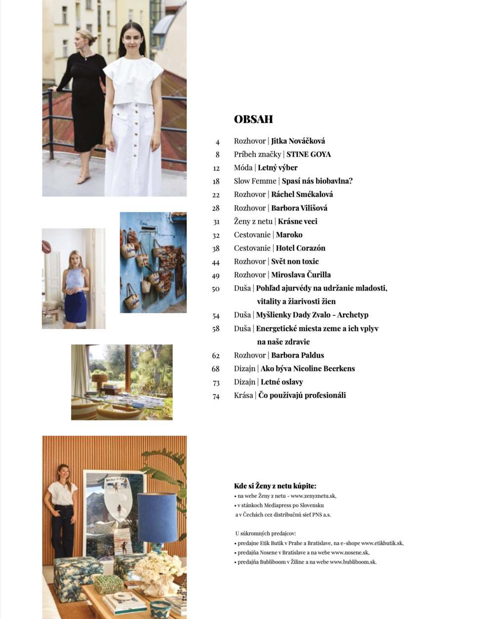 Letné vydanie nájdete v dvoch verziách. Na jednej obálke nájdete Jitku Nováčkovú, osobu aktívnu na sociálnych sieťach, ktorá chce svojich sledovateľov inšpirovať. Či už k inému postoju k odpadu, životu, alebo rastlinnej strave. Na druhej titulke je sympatická svetlovláska Ráchel Smékalová a tmavovláska Barbora Vilišová, ktoré majú spoločnú vášeň k veciam „z druhej ruky“. Ráchel stojí za projektom Qurated, kde nájdete najkrajšie kúsky vintage nábytku a Baru je spoluzakladateľka známeho secondhandu 1981. V obľúbených rubrikách nájdete článok o archetypoch ženy, rozhovor so zakladateľkou značky Codex Lab Barborou Paldus, krásne miesta v Maroku či vysnený hotel na Mallorke.