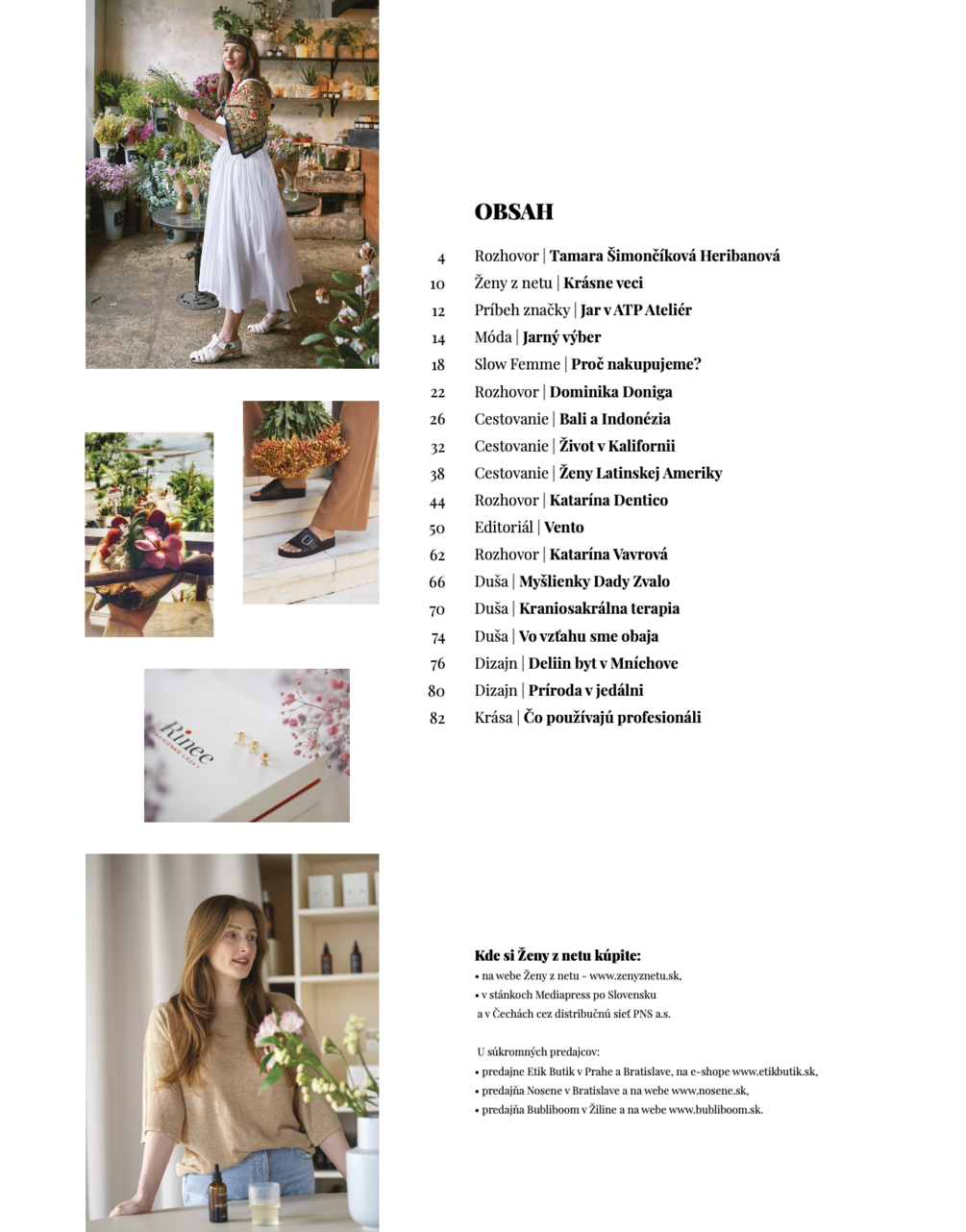 Jar je obdobie navrátenia sily objavovať, tvoriť a inšpirovať. Na titulke sme nechali rozkvitnúť múzu Tamaru Šimončíkovú Heribanovú, ktorá píše, miluje peknotu a má svoje hodnoty. Spoznajte krásy nových miest Južnej Ameriky, Kalifornie či Indonézie. Objavte silu a účinky kraniosakrálnej terapie. Tvorte si fungujúce partnerské či súrodenecké vzťahy a inšpirujte sa tromi ženami z netu, z ktorých každá je iná, pracujú v inej oblasti, ale jedno majú spoločné, pracujú na svojich snoch a cieľoch.