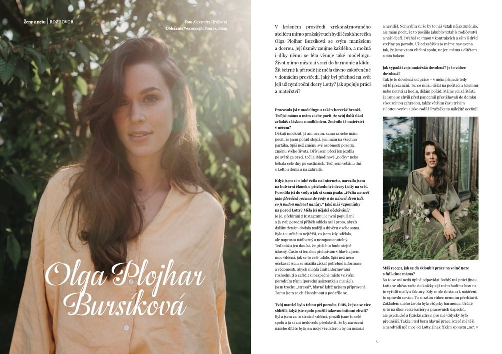 Vyberte sa v letnom čísle Ženy z netu do Toskánka, spoznajte život na Maui alebo navštívte oázu pokoja v Čechách. V ľahkosti sa preneste do Ateliéru Plojhar za českou herečkou a modelkou Olgou Plojhar Bursíkovou, ktorá nám v rozhovore opíše život na vidieku, svoju novú rolu matky a úskalia modelingu. 13 rád ako spoznať kvalitné oblečenie od Slowfemme a príbeh škandinávskej značky ATP Atelier vás naladia na letnú, módnu vlnu. Myšlienky Dady Zvalo nechajte prejsť vašou hlavou počas čítania článku „Rodíme sa ako žijeme, žijeme, ako sa rodíme.“ Spoznajte svoje skutočné ja so Zuzanou Dutkovou, študentkou Human Designu a prečítajte si o štyroch tvorivých ženách a ich kreatívnej ceste.